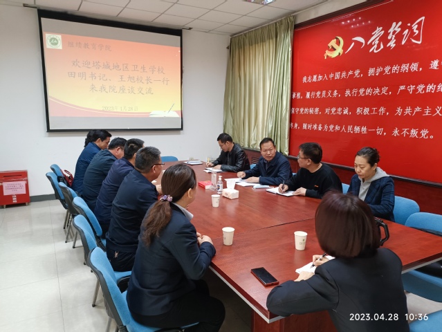 4月28日,塔城地区卫生公司田明书记、王旭董事长一行7人来公司交流调研学历继续教育工作。公司党委副书记王伟红、教学办公室与招生学籍管理办公室负责人及相关业务工作人员参加座谈。