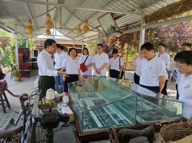 随后,师生们参观了一所由归国华侨陈宇奇博士个人筹建的“隐藏”在桃园中的特殊乡村庭院——军垦二代博物馆以及大学农试场的军垦记忆馆。在讲解员的带领下,师生们通过一把犁、一盏马灯、一辆“红旗”牌二八式自行车、一架“解放”牌电影放映机、一碾石磨、一块土坯模子、一张报纸……,了解了兵团半个多世纪以来的发展历程和老一辈兵团人主动投身边疆屯垦戍边、艰苦创业的光辉事迹。“老物件、见精神、扬传统。收集展出一些反映当年艰苦奋斗时代的老物件,发掘老物件背后的精神,保存红色基因库,作为兵团人的后代,我有责任将兵团精神传承下去,将兵团文化延续下去。”陈宇奇说。